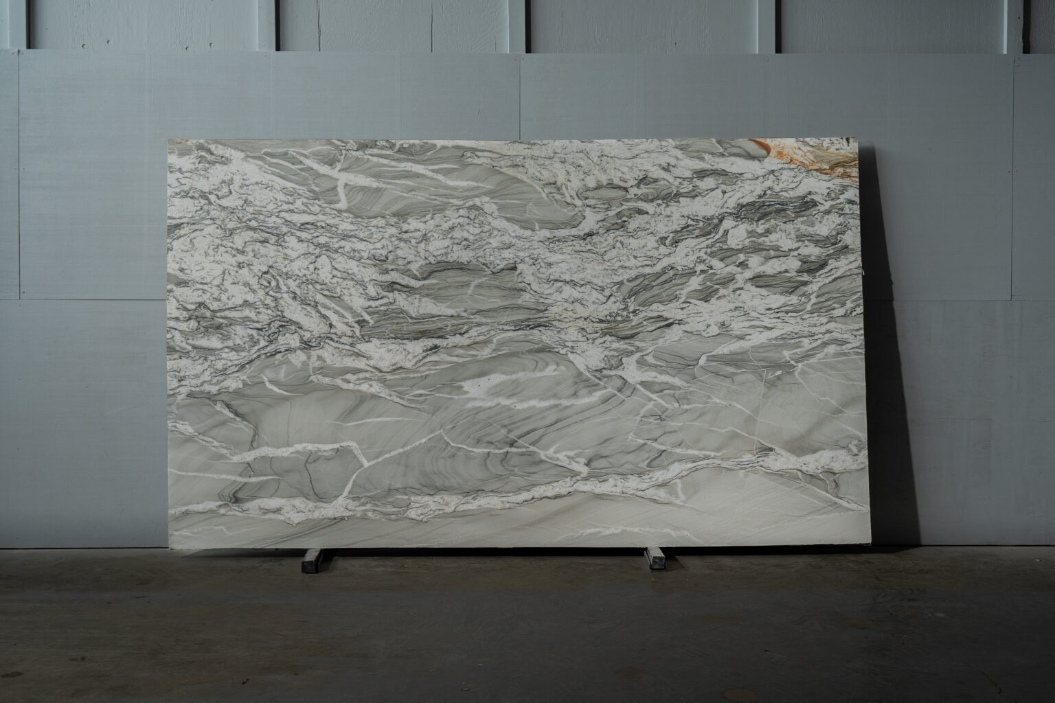 Quartzita sofisticada de movimiento fluido y vetas orgánicas en tonos grises, blancos y matices oscuros. Su acabado honed resalta la profundidad natural de la piedra y aporta una estética contemporánea, elegante y atemporal. Ideal para espacios que buscan carácter sin exceso de brillo.