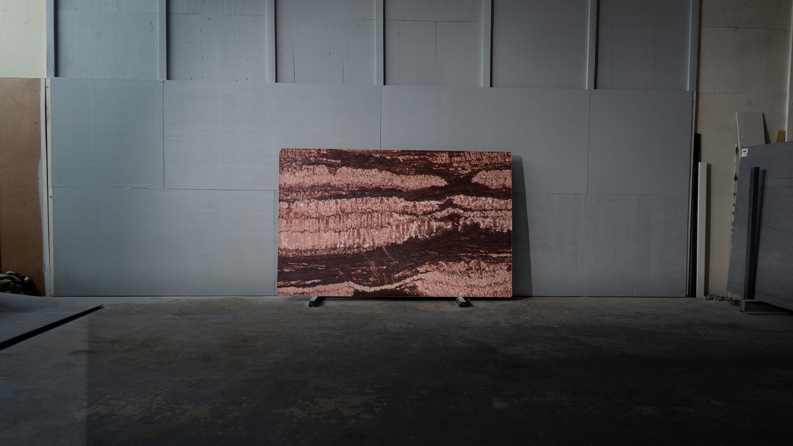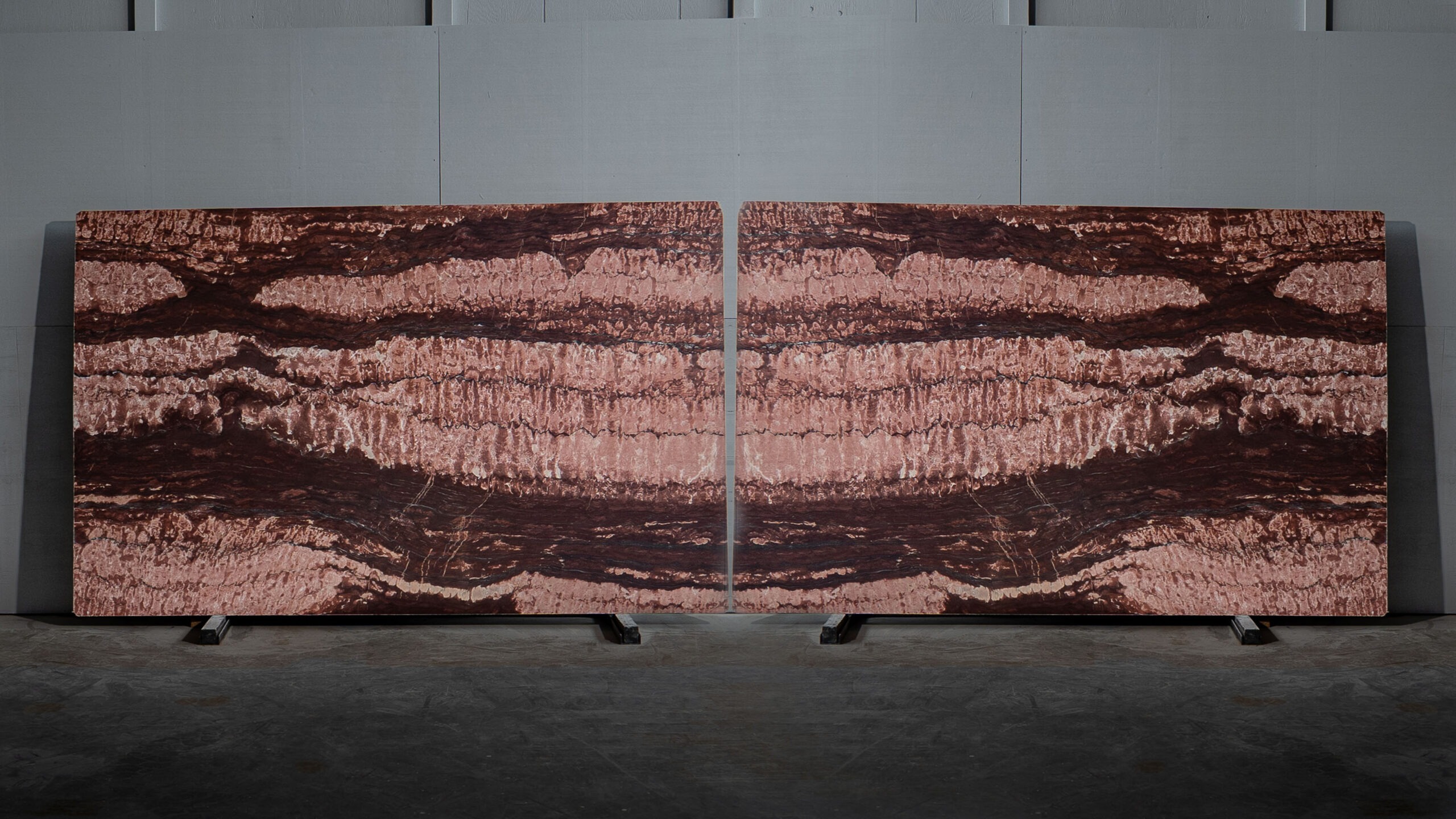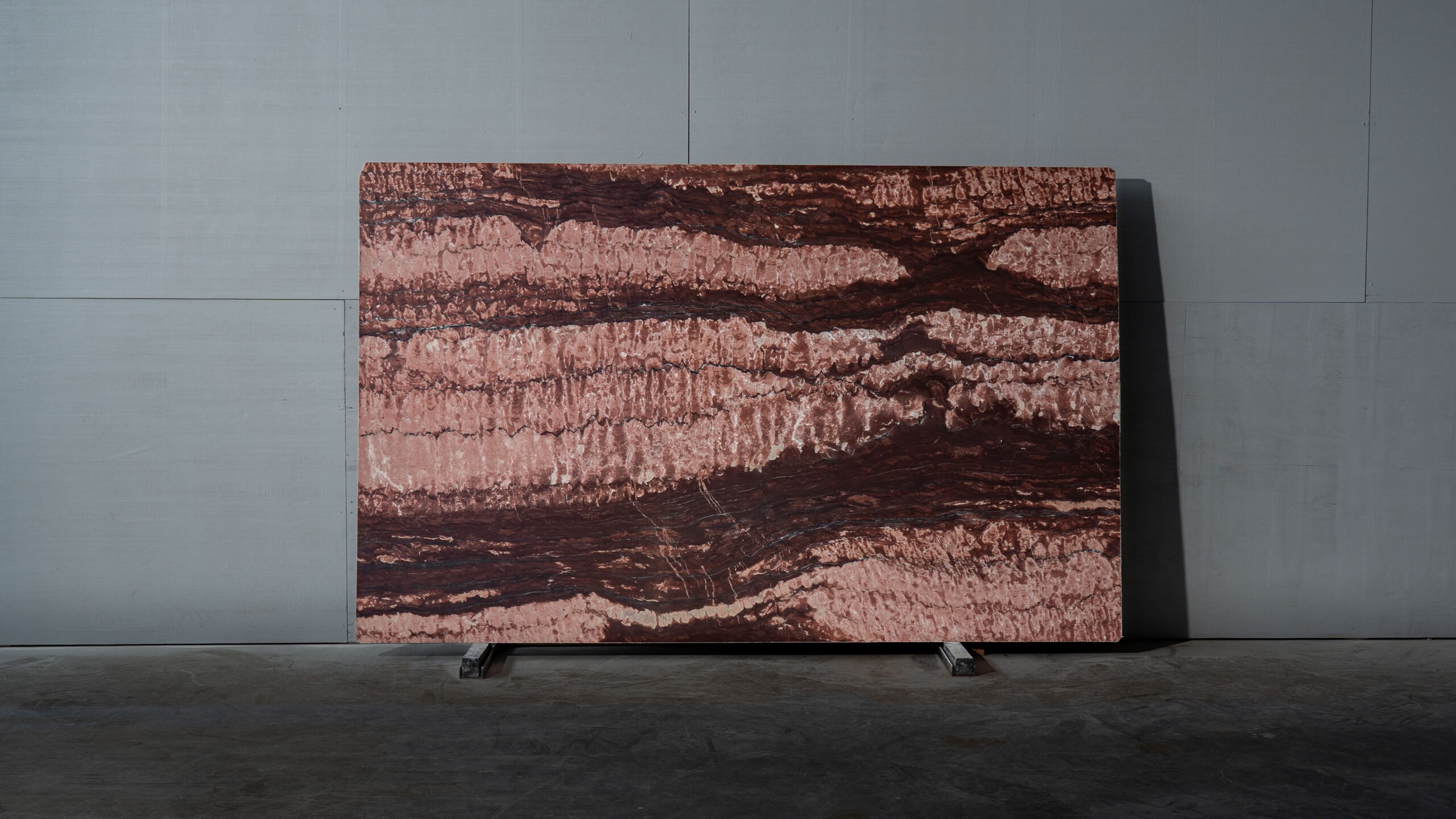 Mármol de tonos burdeos y rosados con vetas horizontales marcadas que aportan carácter y fuerza visual. Su acabado pulido realza la profundidad del color, convirtiéndolo en una pieza protagonista para interiores de alto impacto y diseño contemporáneo.