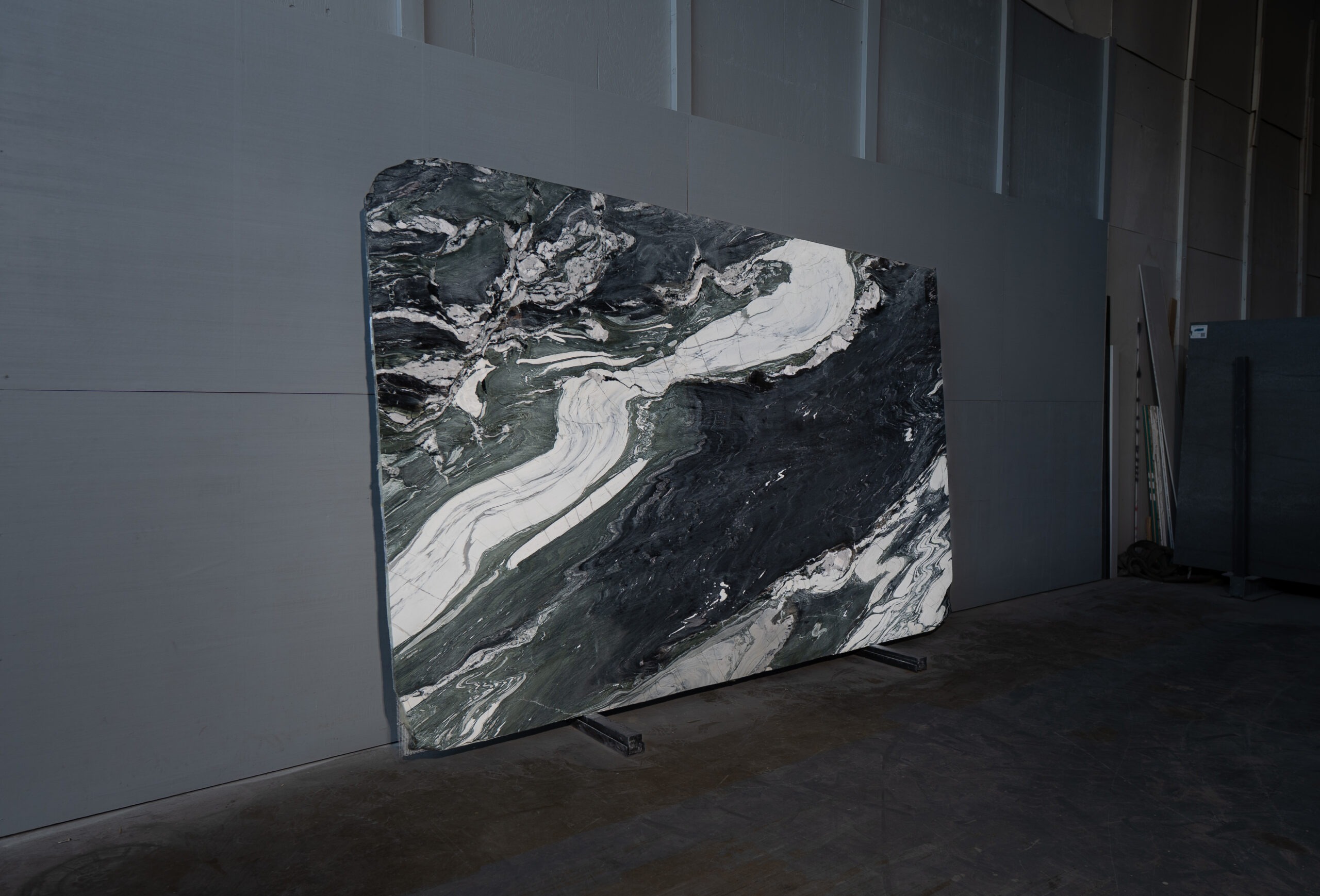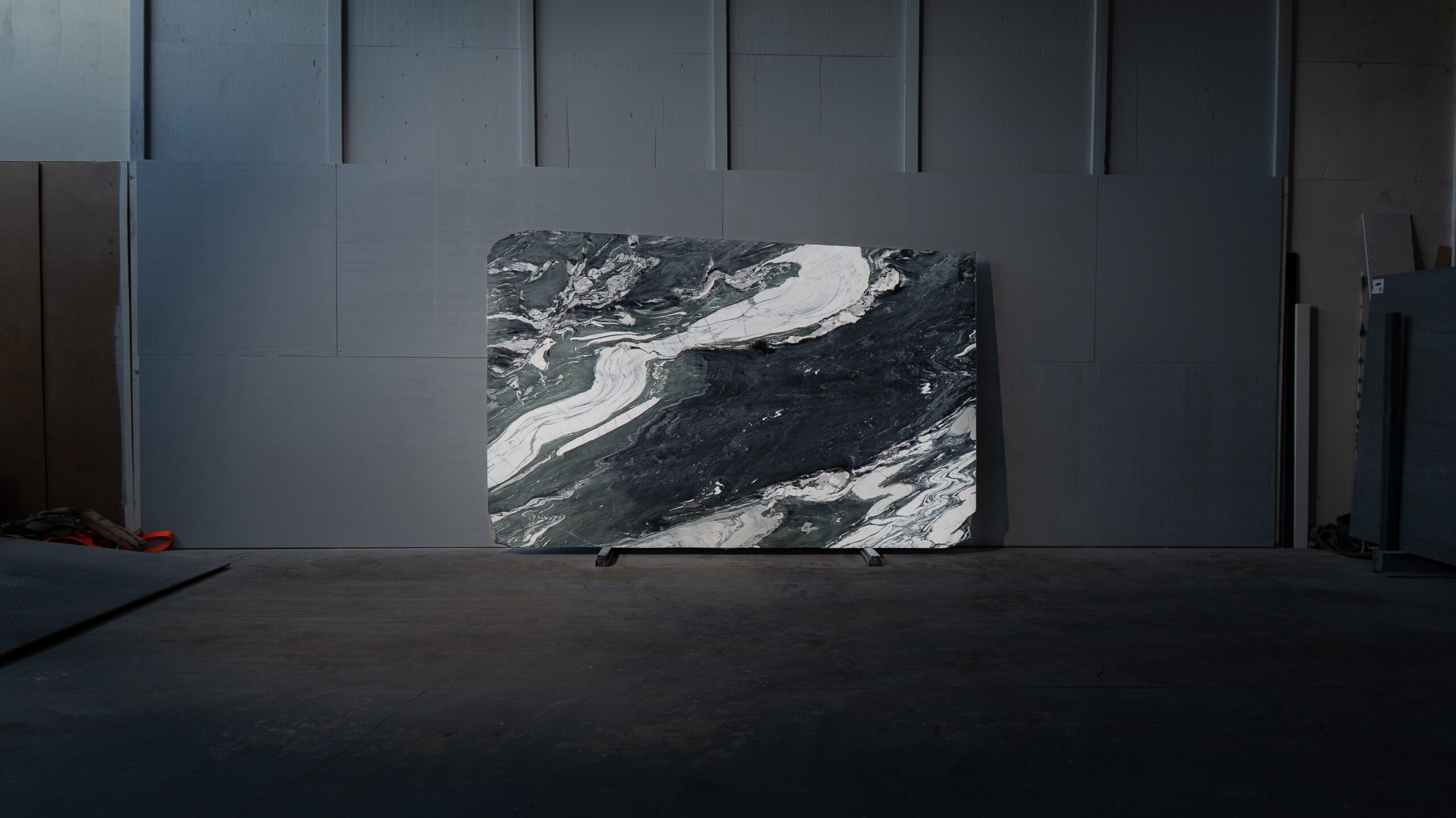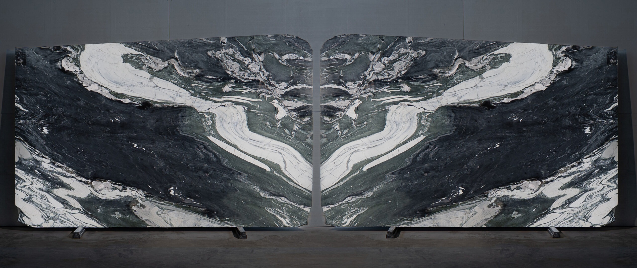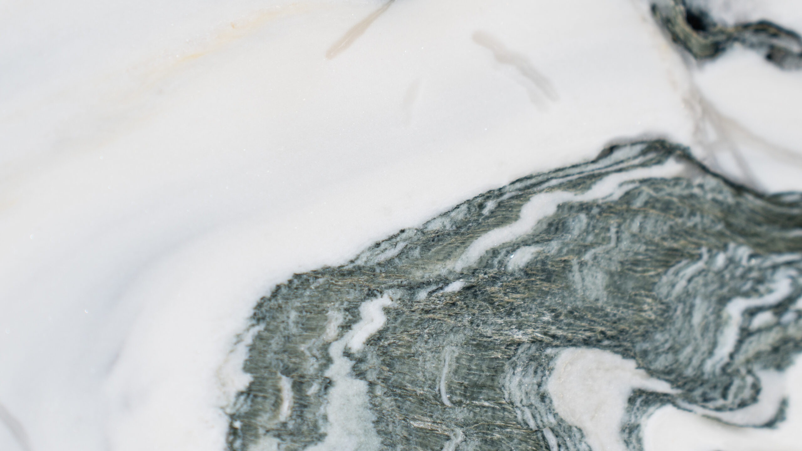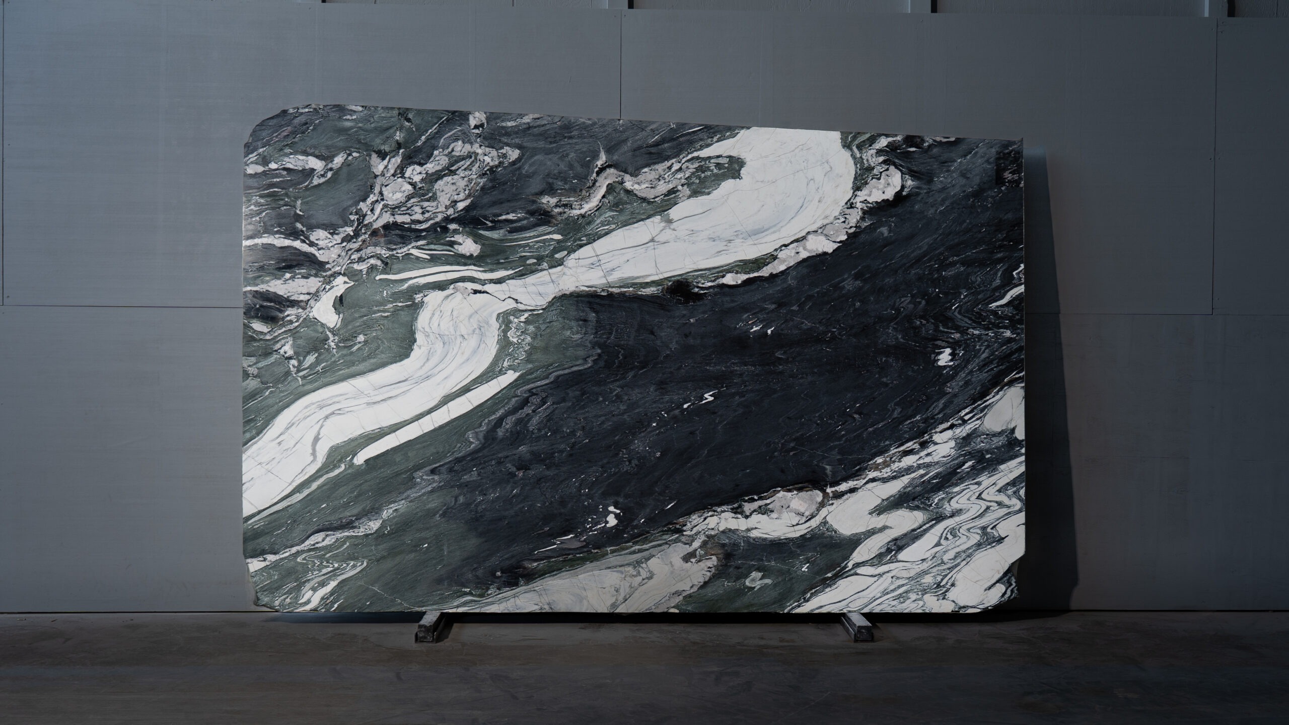 Mármol de fondo oscuro con vetas fluidas en tonos blancos, grises y verdes que generan un movimiento marcado y contemporáneo. Su acabado pulido intensifica el contraste natural de la piedra, ideal para interiores modernos y espacios de alto carácter visual.
