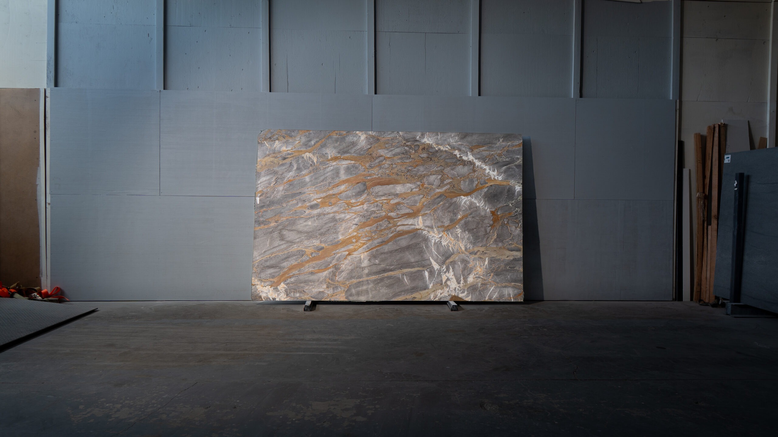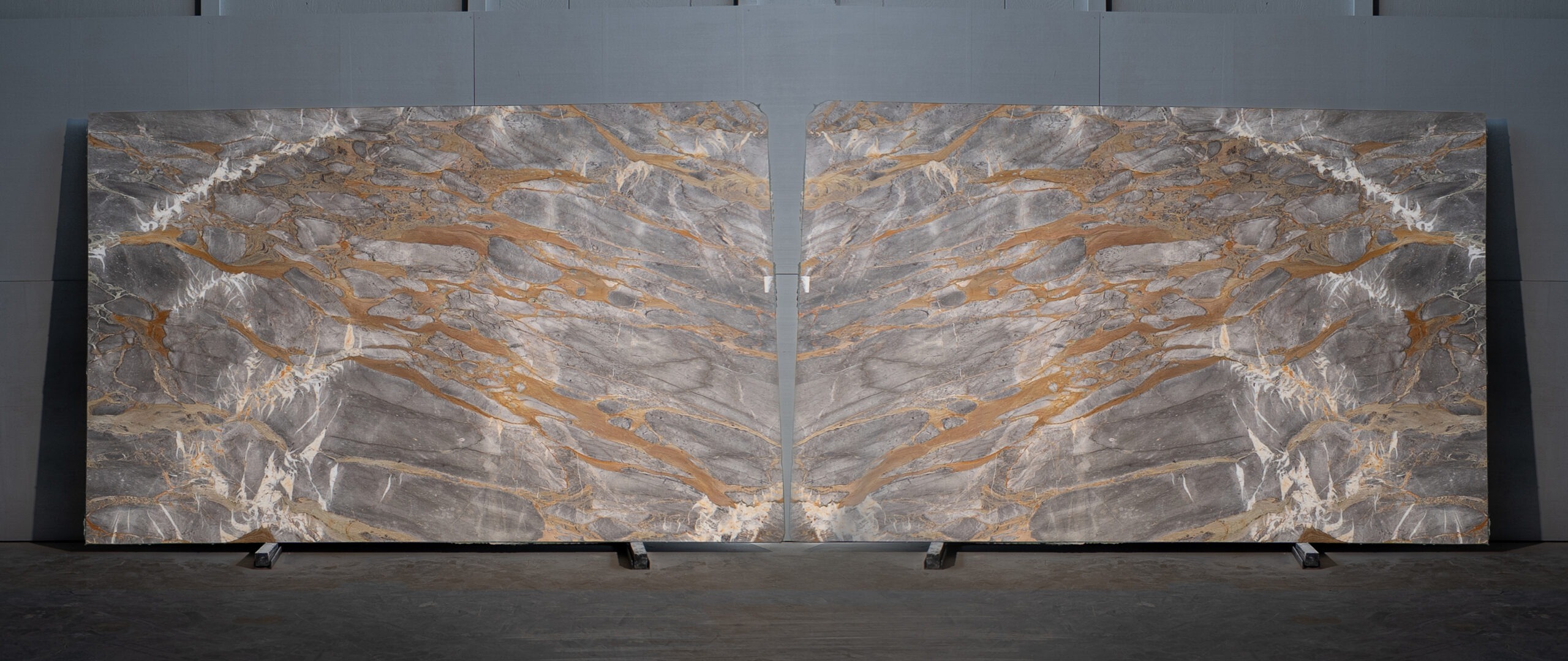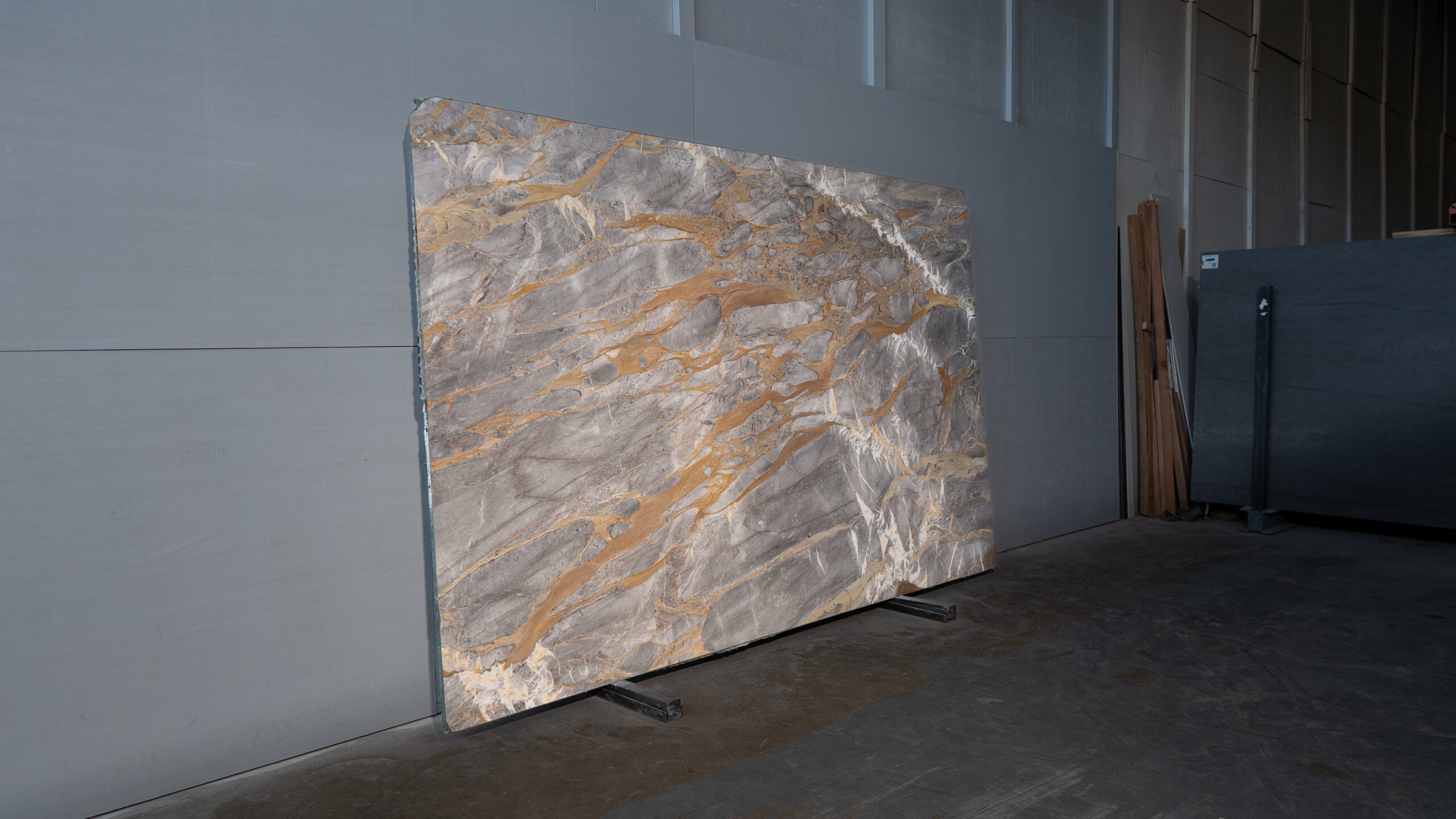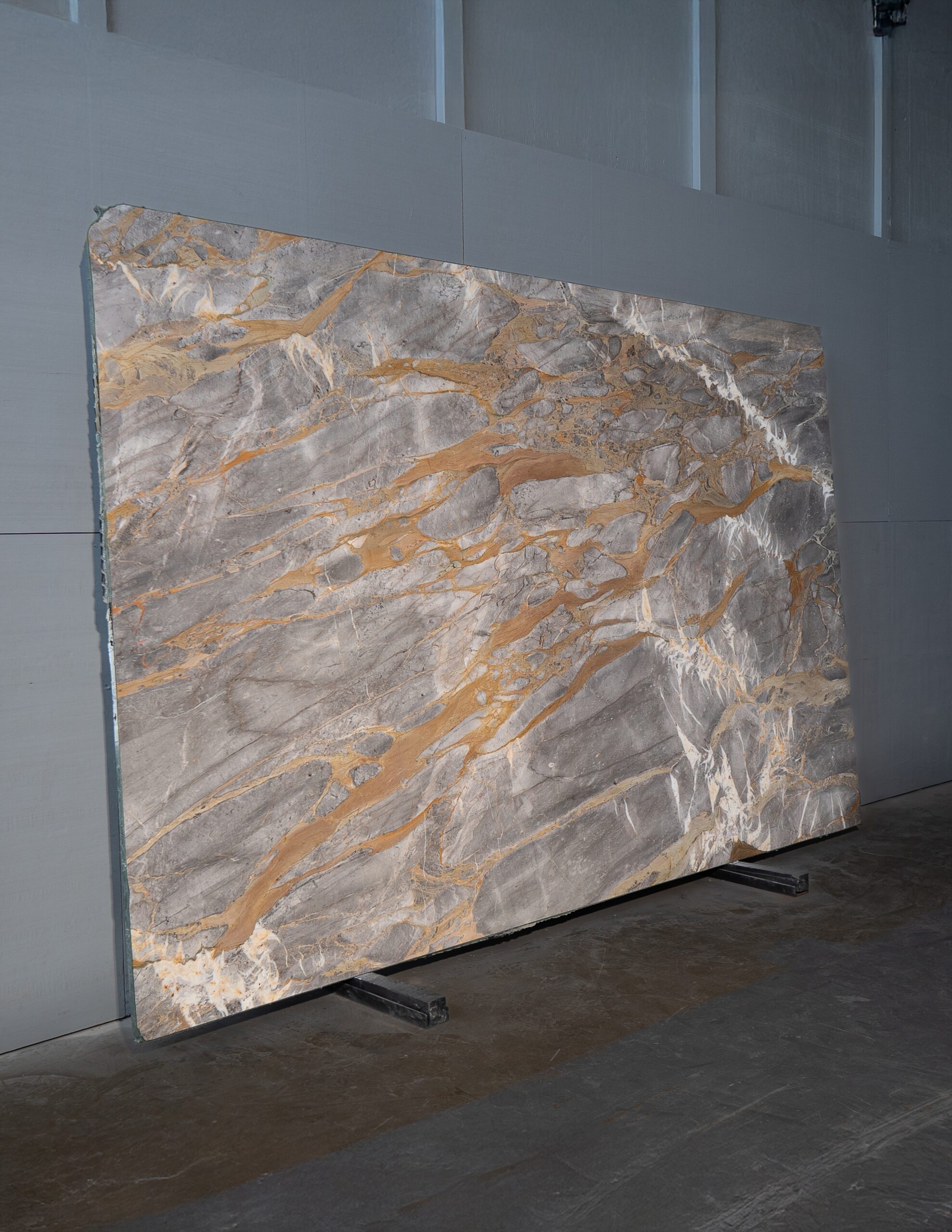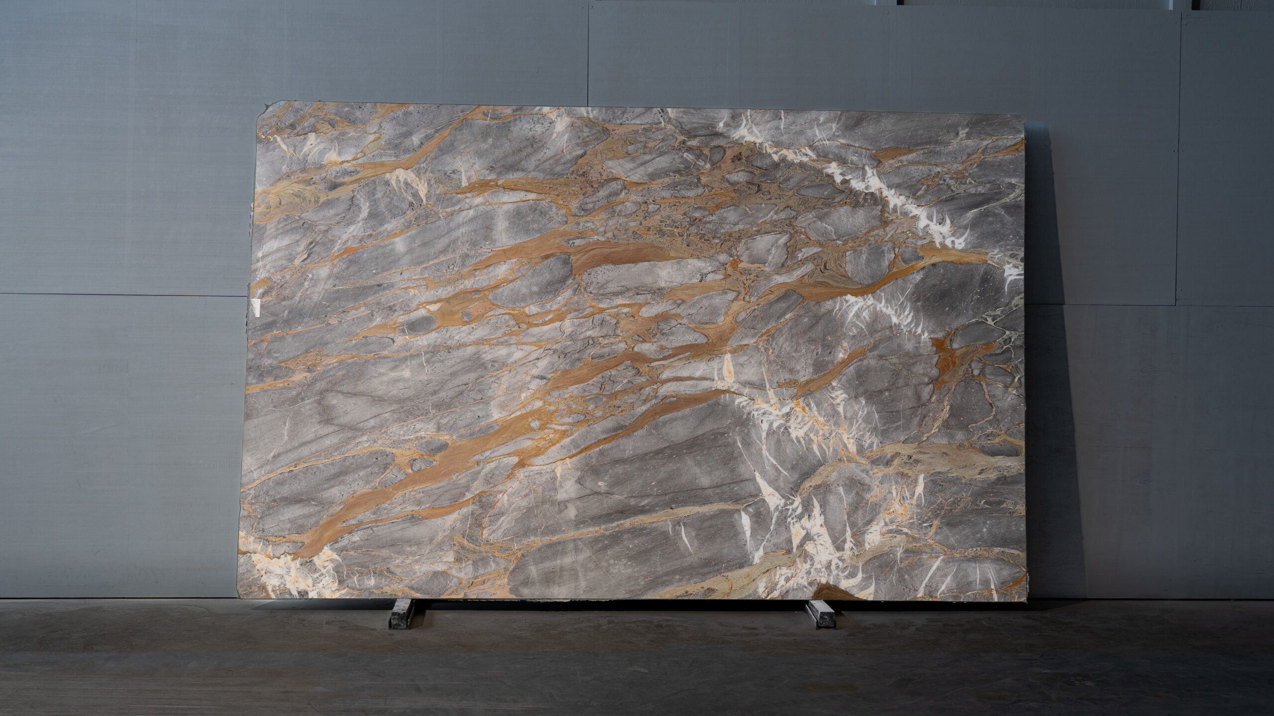 Mármol de base gris con vetas doradas y blancas que crean un contraste elegante y sofisticado. Su acabado pulido realza el brillo natural de la piedra, ideal para interiores contemporáneos donde se busca carácter y distinción.