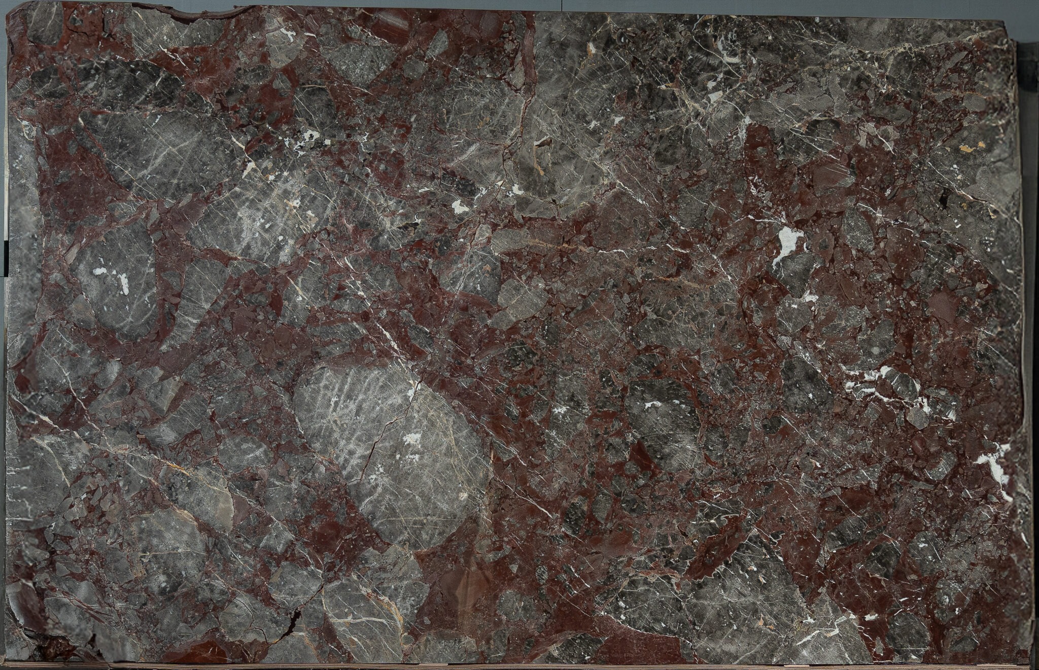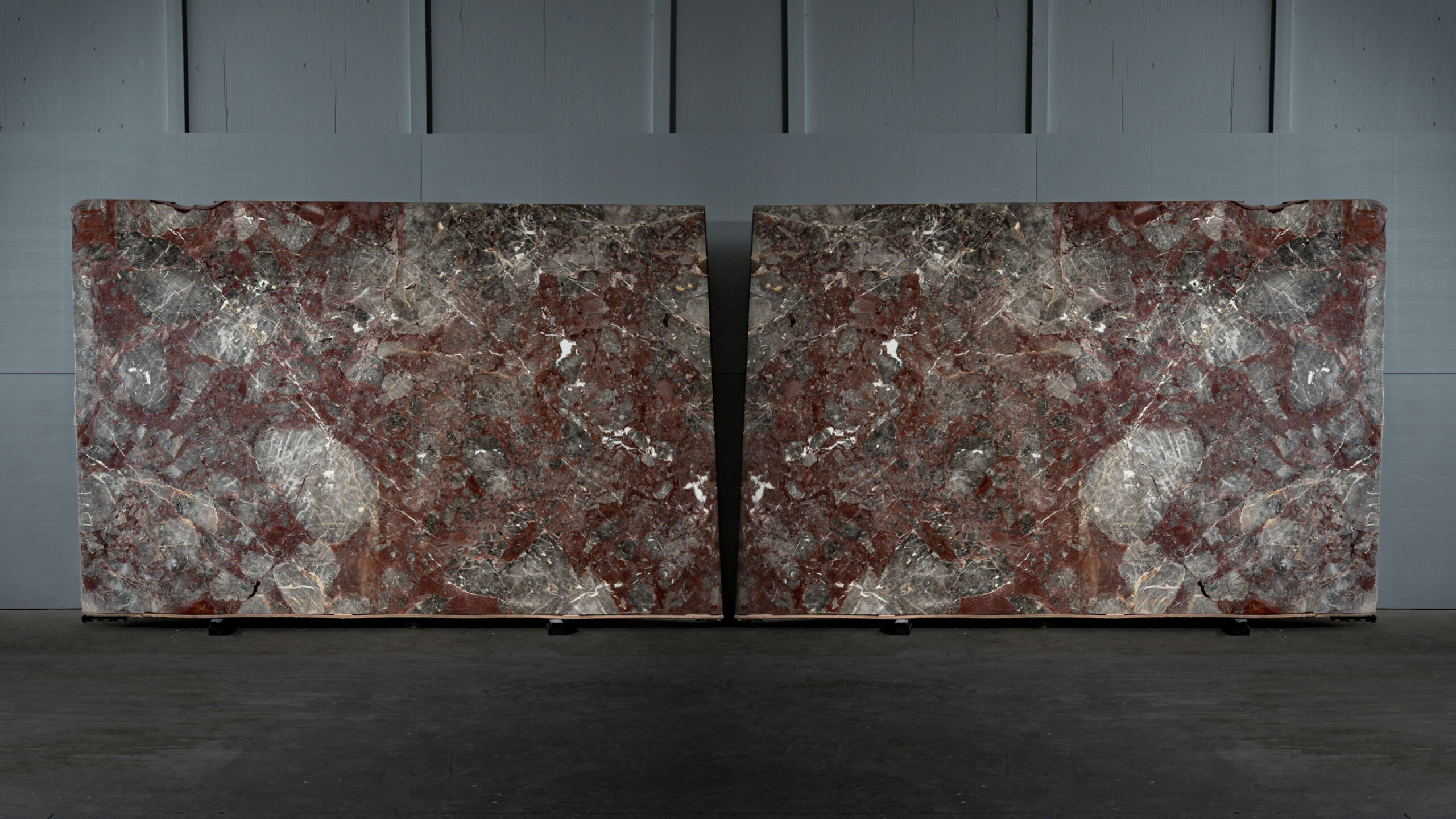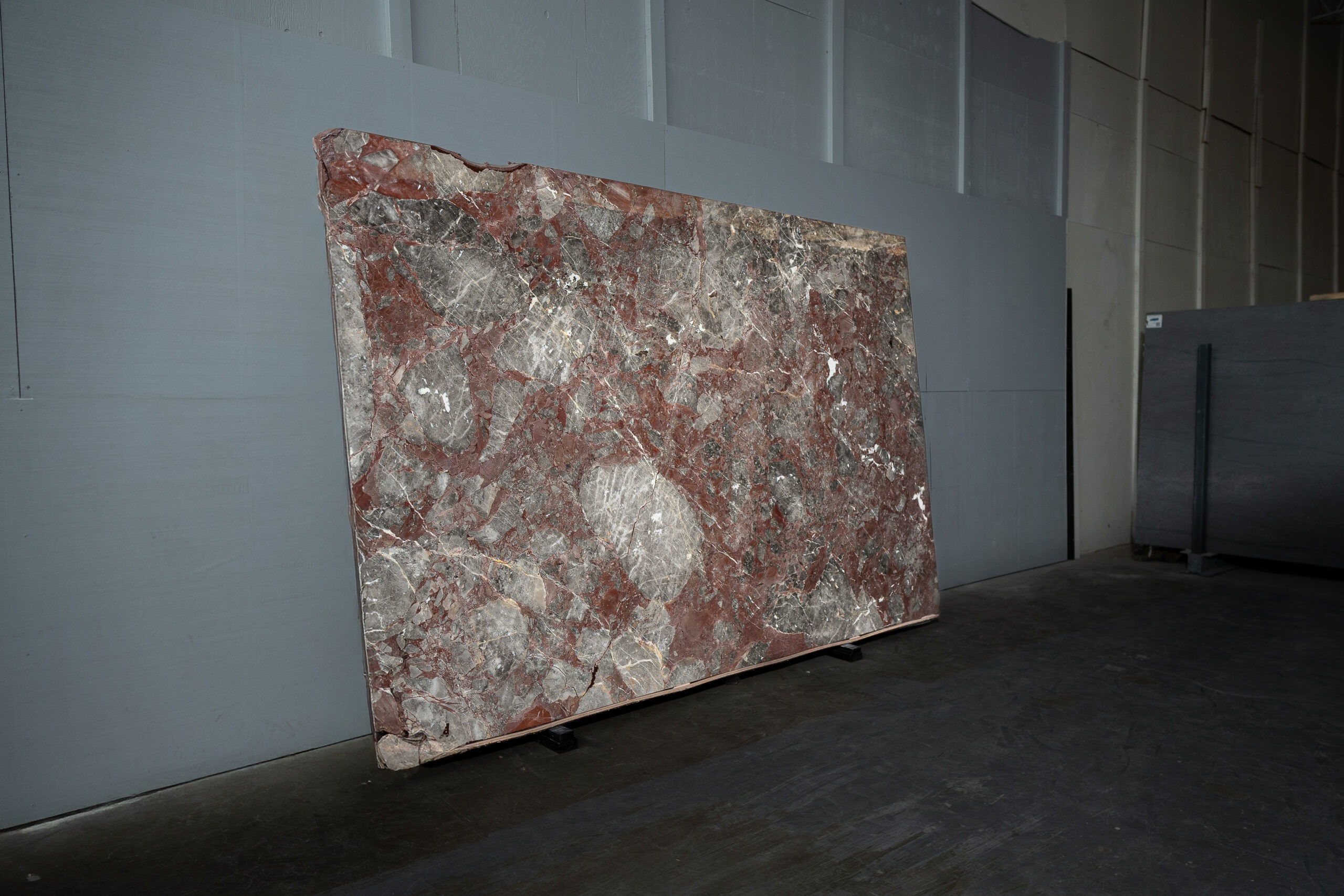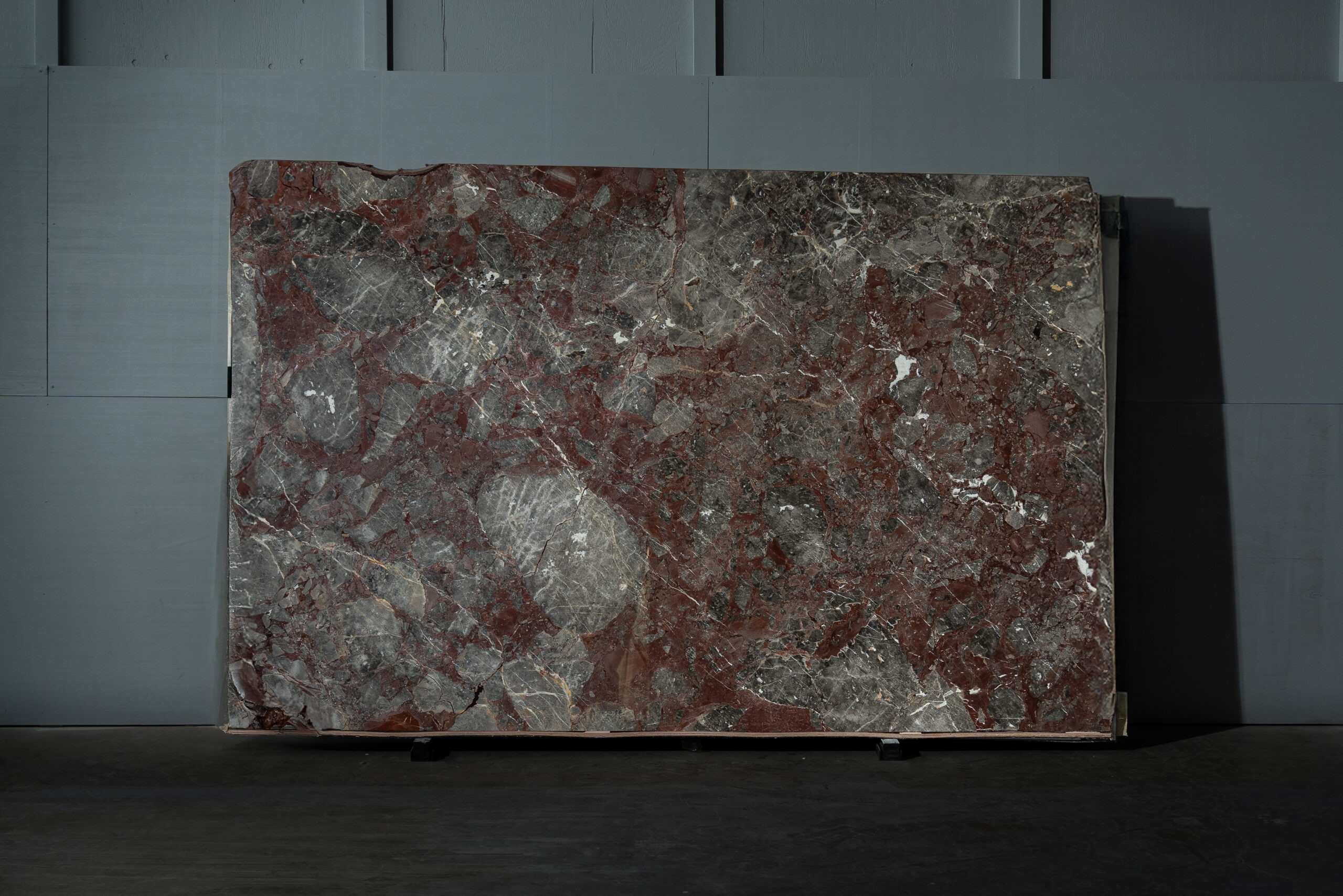 Breccia Firenze es un mármol natural de carácter intenso y sofisticado, reconocido por su composición fragmentada y contrastes profundos. La interacción entre tonos negros, burdeos, grises y blancos crea una superficie dramática y elegante, con una presencia visual fuerte y refinada.