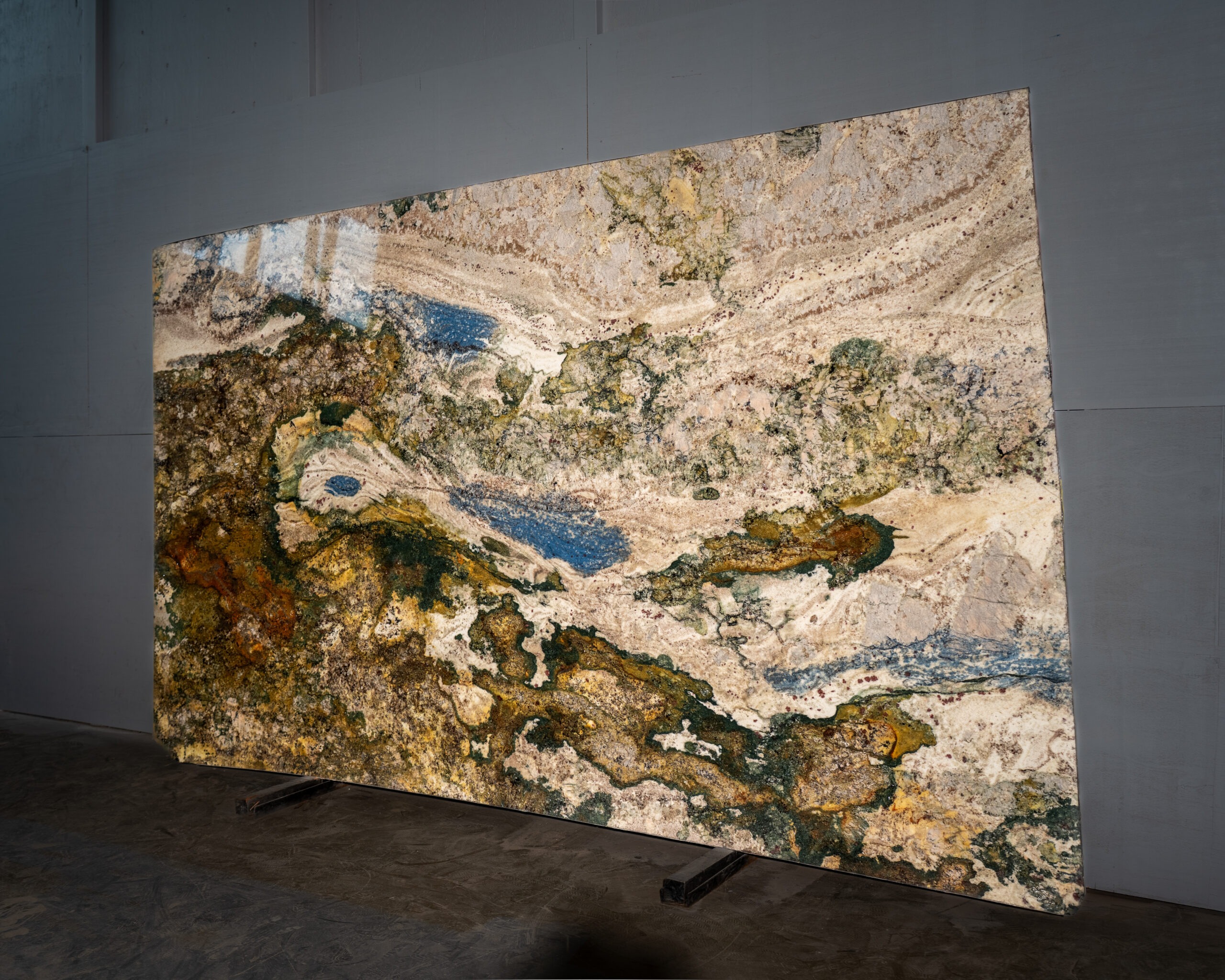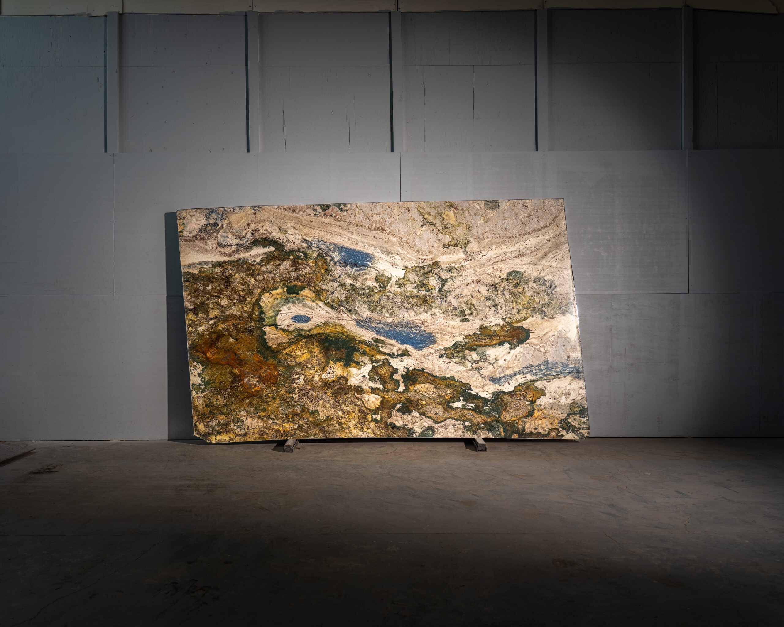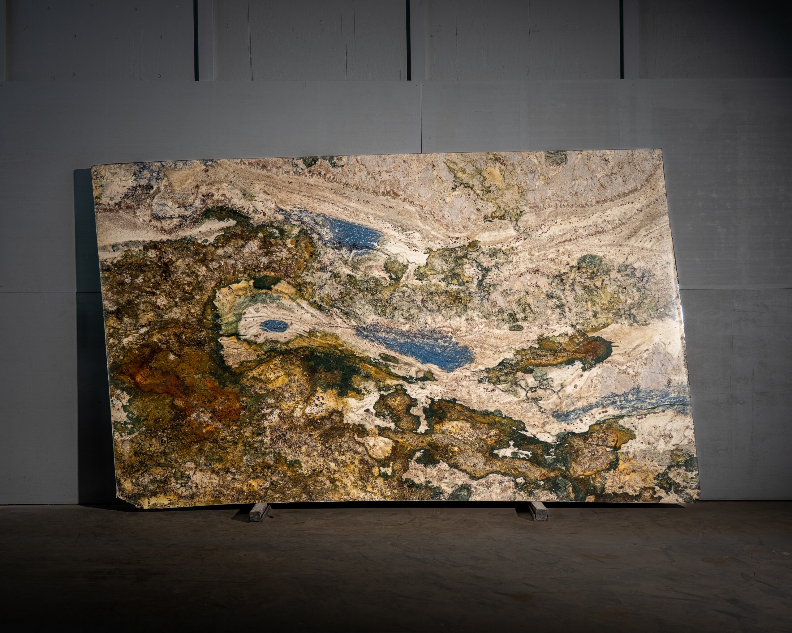 Quartzita de alto carácter artístico, con vetas orgánicas y contrastes naturales en tonos azules, dorados, verdes y amarillos. Su acabado polished realza la profundidad cromática de la piedra, convirtiéndola en una pieza protagonista para espacios únicos.